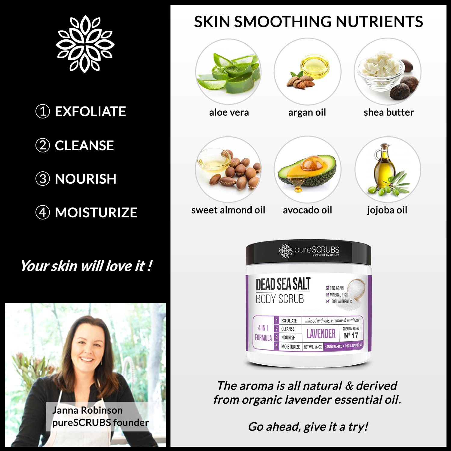 - GET ULTRA SMOOTH SKIN FAST - THIS WORKS! Our unique “4 in 1 Formula” does everything a body scrub should do and more - EXFOLIATE, CLEANSE, NOURISH & MOISTURIZE. Fine grain dead sea salt infused with essential oils, nutrients and skin softeners helps to smooth away rough, bumpy, and uneven textures to instantly reveal your true soft, healthy and radiant skin. You'll love the lavender aroma!