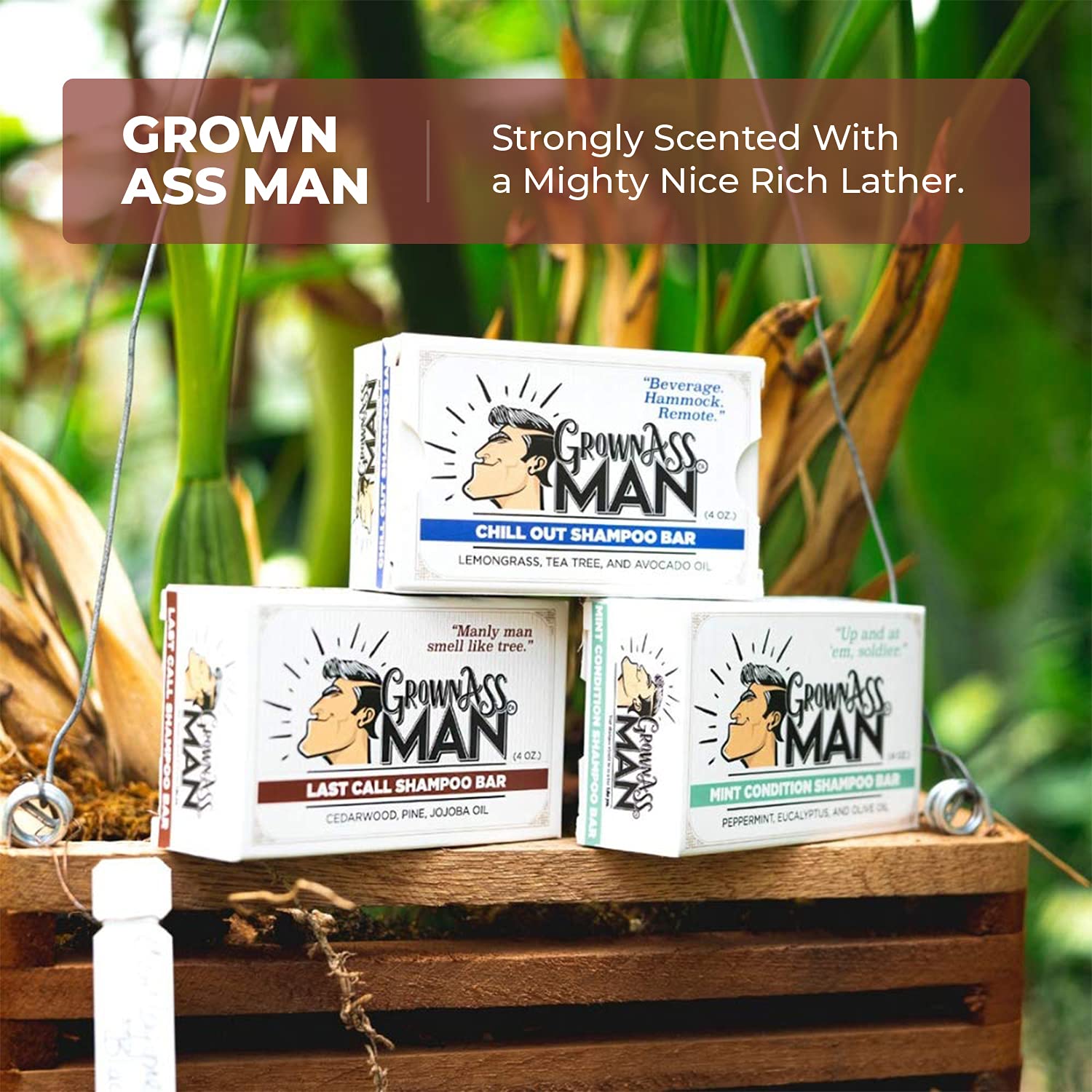 - STRONGLY SCENTED WITH A MIGHTY NICE RICH LATHER. We want you to smell good all day, and, after all - you're a man and you might not even notice unless we made it strong. The rich lather makes sure that the fine ingredients we build into every Grown Ass Man Co., Shampoo bars reach all of your hairs and your scalp. Lather has a purpose? Oh yes. Yes it does.