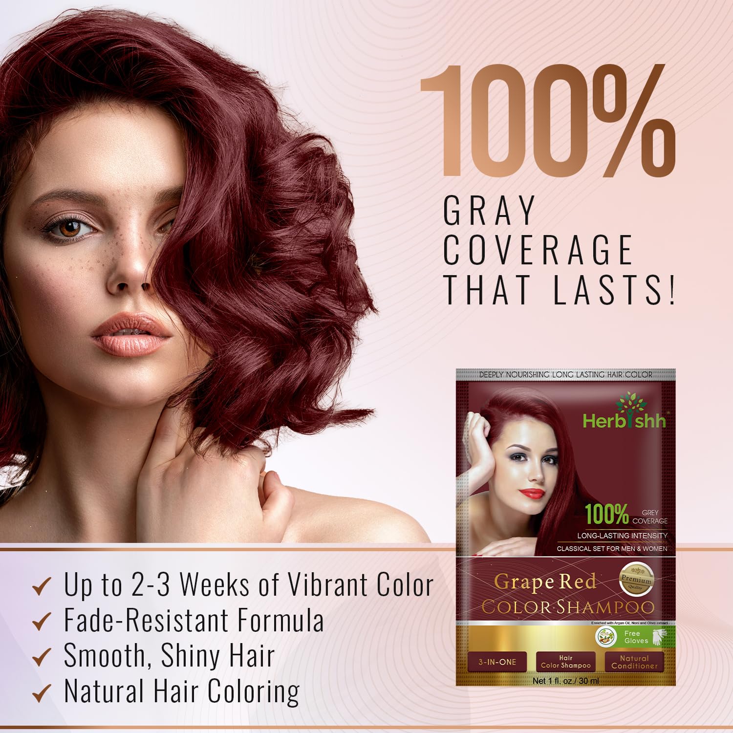 - LONG LASTING GREY COVERAGE β Give your greying hair a new lustrous, vibrant, and young look, while replenishing the lost health of weak strands with Herbishh Hair Color Shampoo for Grey Hair. With a special combination of active botanicals, our hair color shampoo dye is sure to give your hair a deep grape red color that will last up to 2 to 3 weeks.