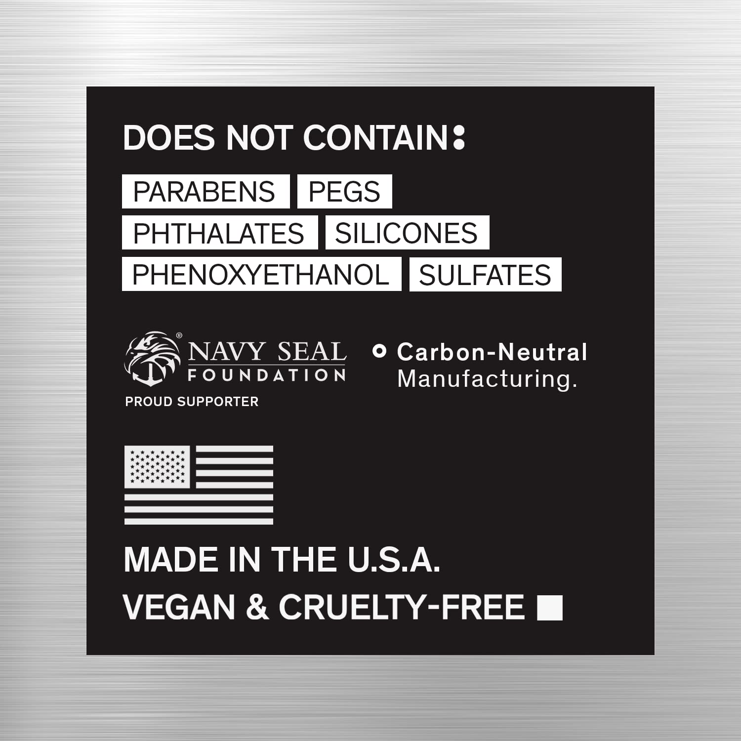 - Cradle to Cradle Bronze Certified: Does not contain parabens, phthalates, phenoxyethanol, silicones, sulfates, or PEGS. Vegan & Cruelty-Free. 99% biodegradable & carbon neutral manufacturing. Proud supporter of the Navy Seal Foundation. Made in the USA.