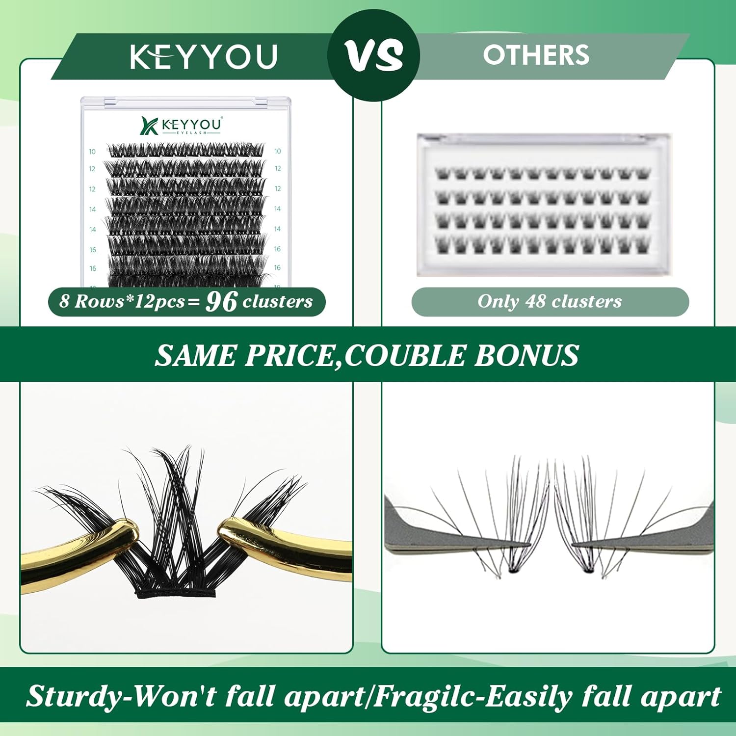 - 【Soft&Comfortable】KEYYOU lash cluster are made of imported materials,the stem line is thinner and softer, the eyelash cluster are lighter and more comfortable to wear.96 clusters in one tray ,more cost-effective.