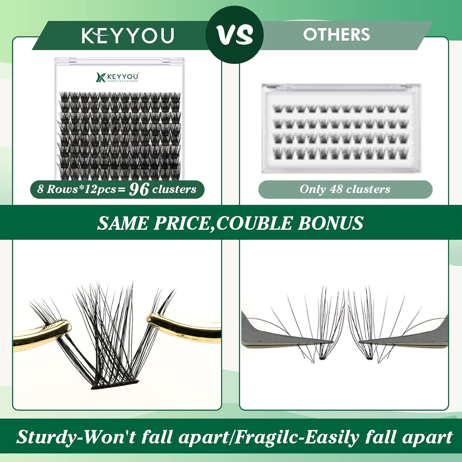 - 【Soft&Comfortable】KEYYOU lash cluster are made of imported materials,the stem line is thinner and softer, the eyelash cluster are lighter and more comfortable to wear.96 clusters in one tray ,more cost-effective.