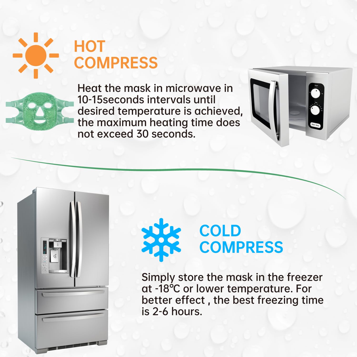 - 【CONVENIENT TO USE】simply store the mask in the freezer at -18℃ or lower temperature for at least 2 hours.Heat the mask in microwave in 10-15seconds intervals until desired temperature is achieved,the maximum heating time does not exceed 30 seconds.