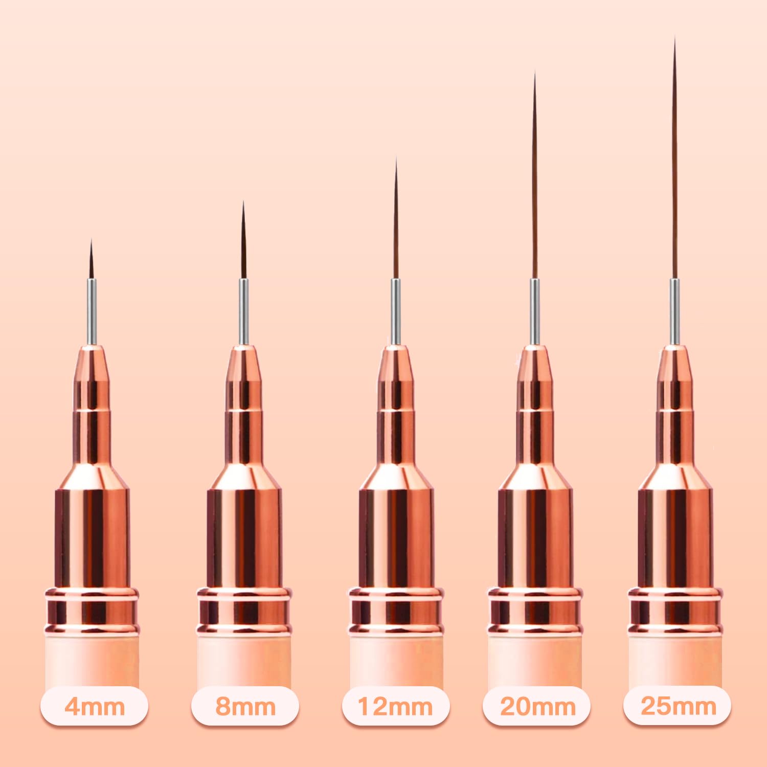 - Professional Nail Art Brushes: The thin nail art brush set contains 5 different size nail brushes 4mm, 8mm, 12mm, 20mm and 25mm. The total length of the pen: approx. 17.8 cm/ 7 inches.