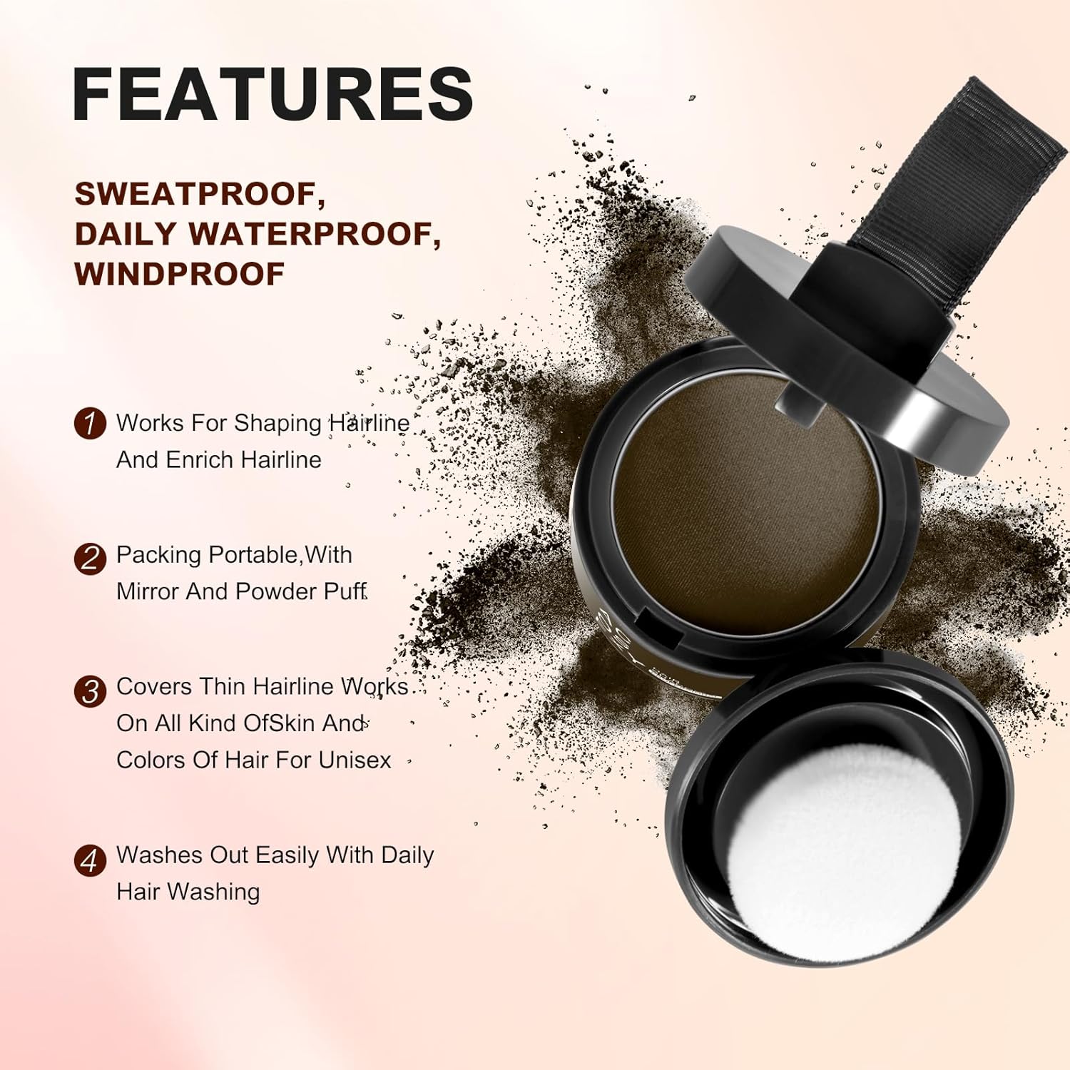 - 1.Instant Coverage Hair Root Touch Up -The Acosexy Hairline Powder puff can accurately cover the roots of hair. Locks on Until You Shampoo: Hair loss? Skip the embarrassing all-day touch-ups .The color is firm. Make the hair fluffy. Will Makes hair color natural and vibrant. Great for all hair types and texture!