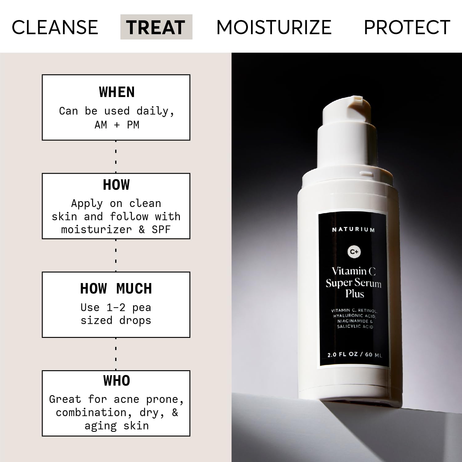 - MOST SKIN TYPES: Appropriate for those with aging, blemish-prone, combination, and dry skin, though a patch test prior to use is advised. Can be applied daily (AM + PM), using 1-2 pea sized drops on clean skin, following with a moisturizer and SPF