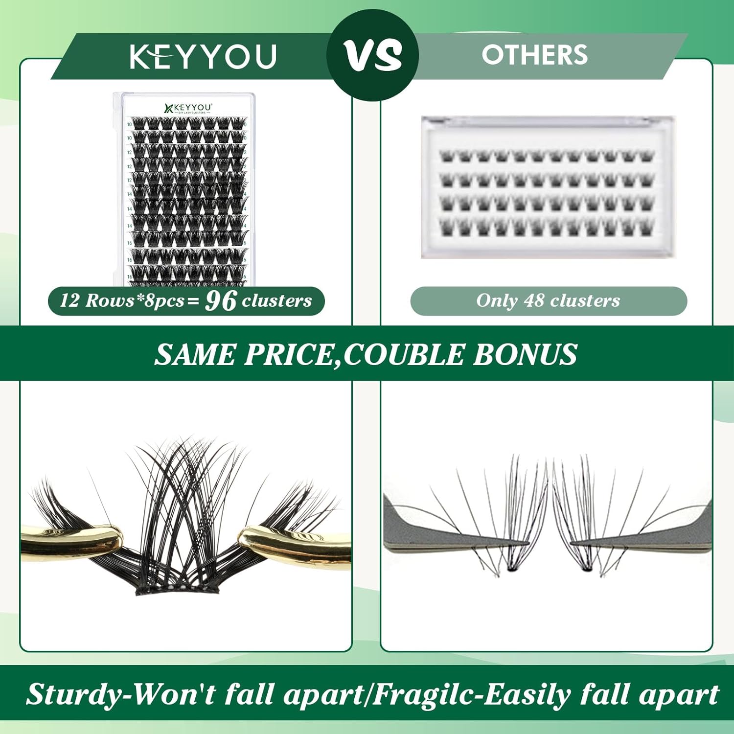 - 【Soft&Comfortable】KEYYOU lash cluster are made of imported materials,the stem line is thinner and softer, the eyelash cluster are lighter and more comfortable to wear.96 clusters in one tray ,more cost-effective.