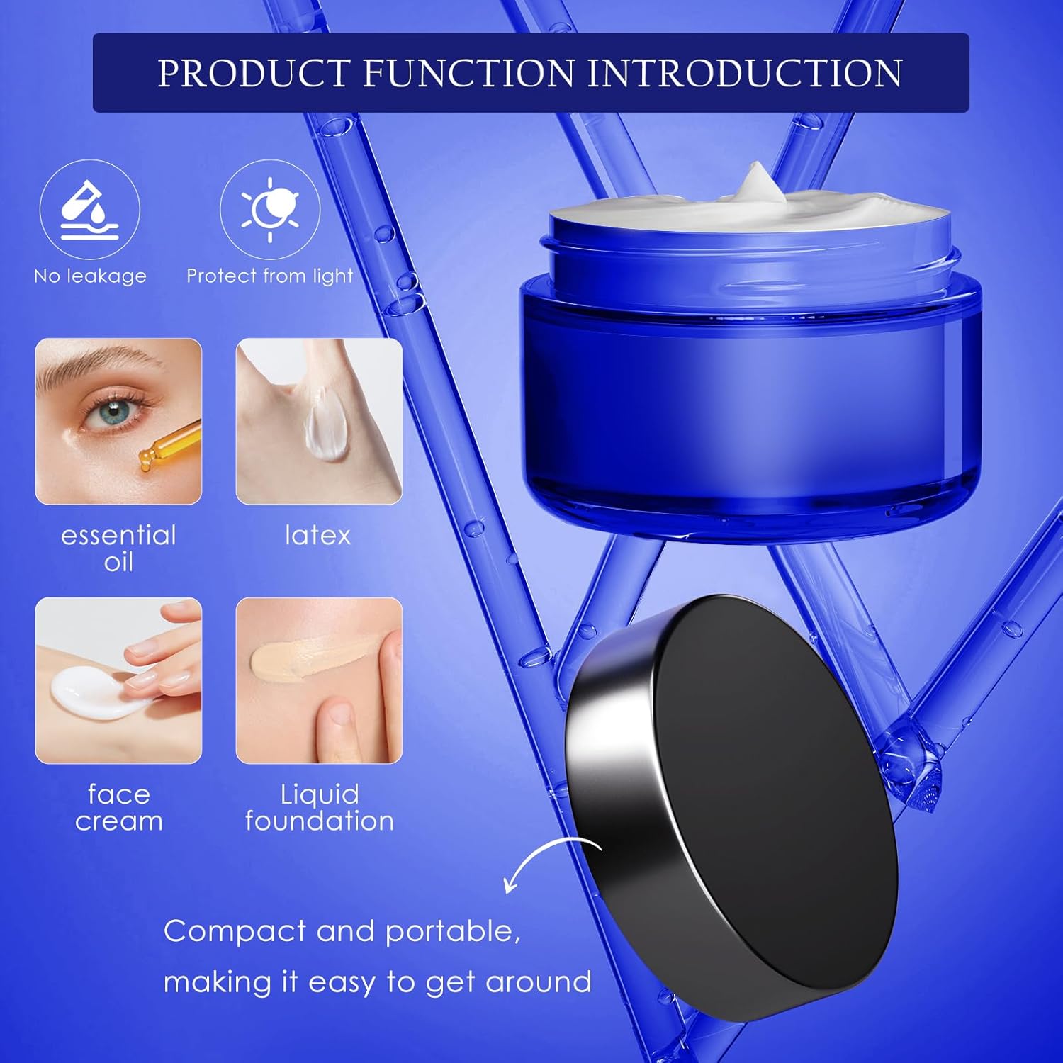 - Include: Set of 12 PCS, 2 Oz cobalt blue glass jars with inner liners and black lids. These 2 Oz containers are made of eco-friendly, durable, toxic-free, glass material.Please use cold water when cleaning