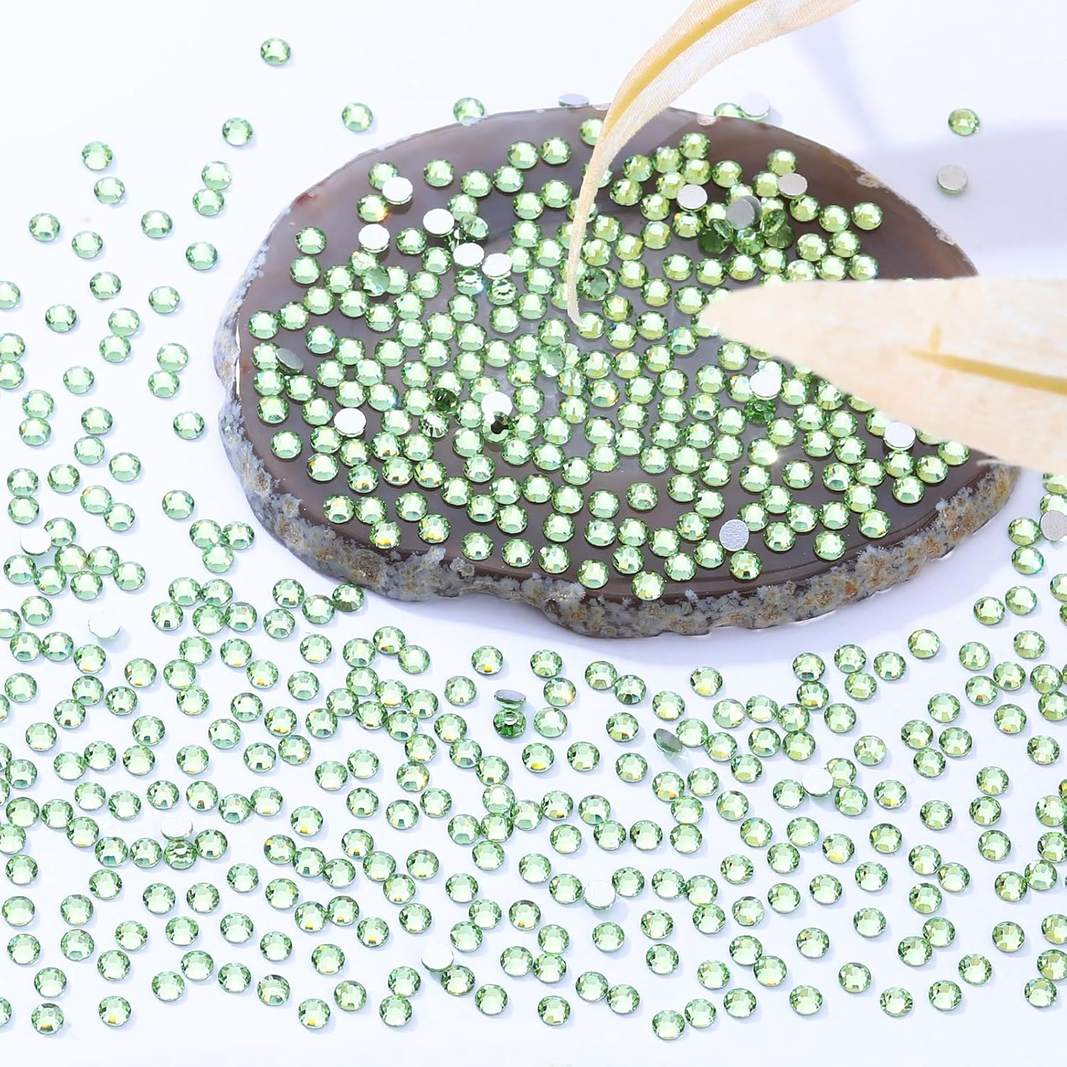 - Product Packaging: Bags packaging SS8 2.3~2.5 MM - 2880 Pcs light green flatback rhinestones.