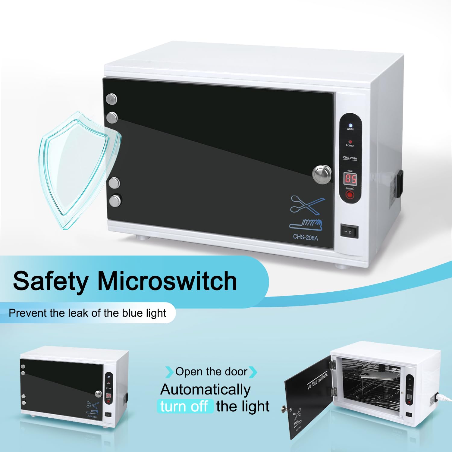 - ✅ LED TIMER DISPLAY LARGE CAPACITY CLEANING MACHINE - The Light cleaner has a sturdy glass door, a metal shelf, and an inner cabinet made of stainless steel with a brilliant led light. In order to keep dangerous rays within and prevent unintentional exposure, the light cabinet has an insulated door and an auto shut-off system. The light goes out when the door is opened, and it comes back on when the door is shut. Nail tool cleaning cabinet for esthetician also comes with two removable trays for easy storage.