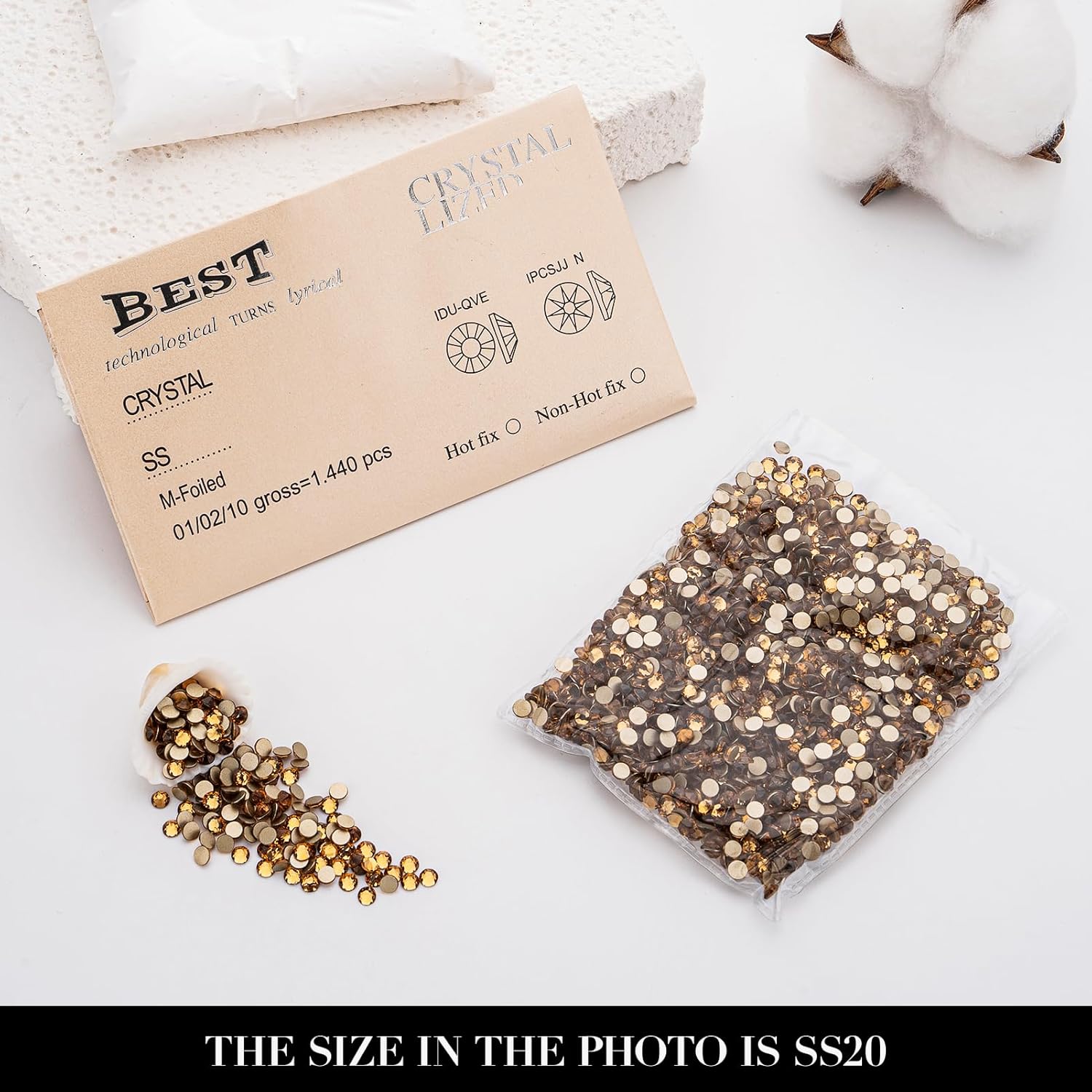 - PACKAGE DETAILS: Pack of 1440 pieces Topaz rhinestones SS20, size 4.6-4.8mm.