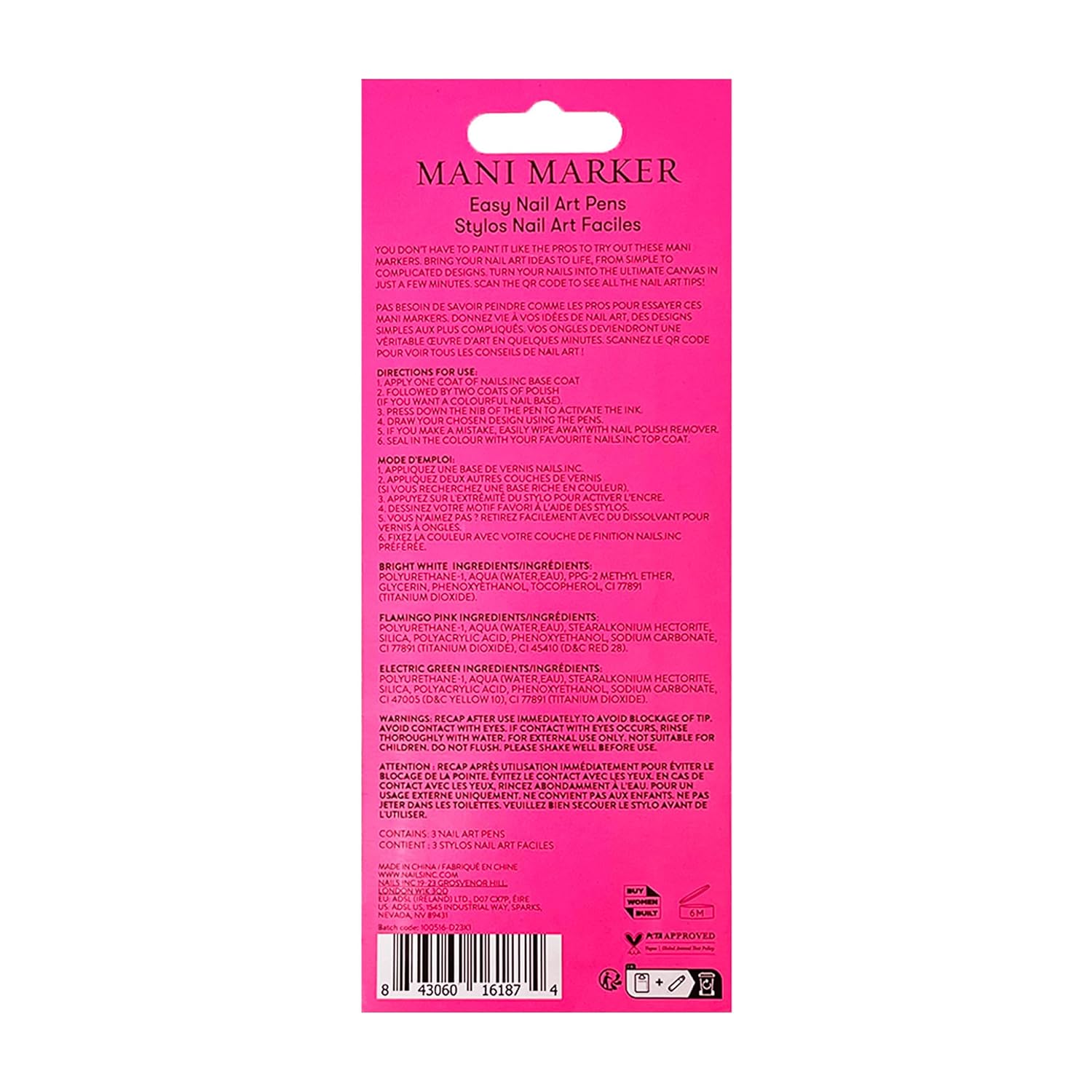 - Included Components : BRIGHT WHITE MANI MARKER, FLAMINGO PINK MANI MARKER, LIME GREEN MANI MARKER