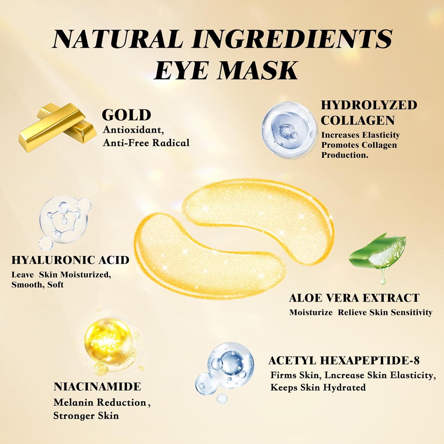 - TARGETED TREATMENT EYE GELS - under eye mask under eye patch enriched with 24K gold, collagen, sodium hyaluronate, aloe vera extract, effectively improves eye wrinkles, eye bags dark circles, puffiness under the eyes, these collagen eye mask patches act as a rich fortress for eye mask skincare to rejuvenate your eye area.