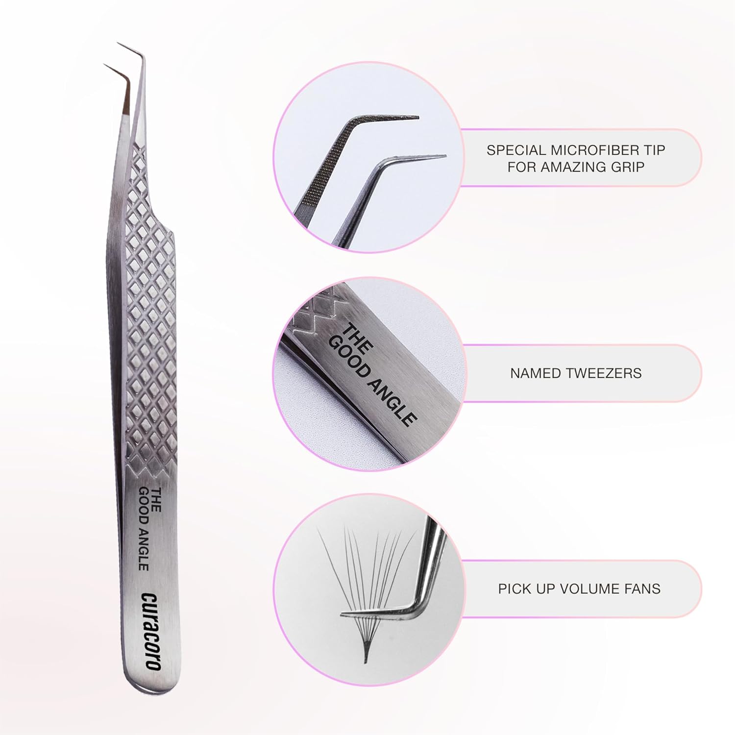 Curacoro Lash Tweezer - Professional & Precision Fiber Tip Grip Lash Tweezers for Eyelash Extensions, Multi Shapes & Purposes Tweezers for Volume, Isolation & Classic Lashes (Silver, The Good Angle)
