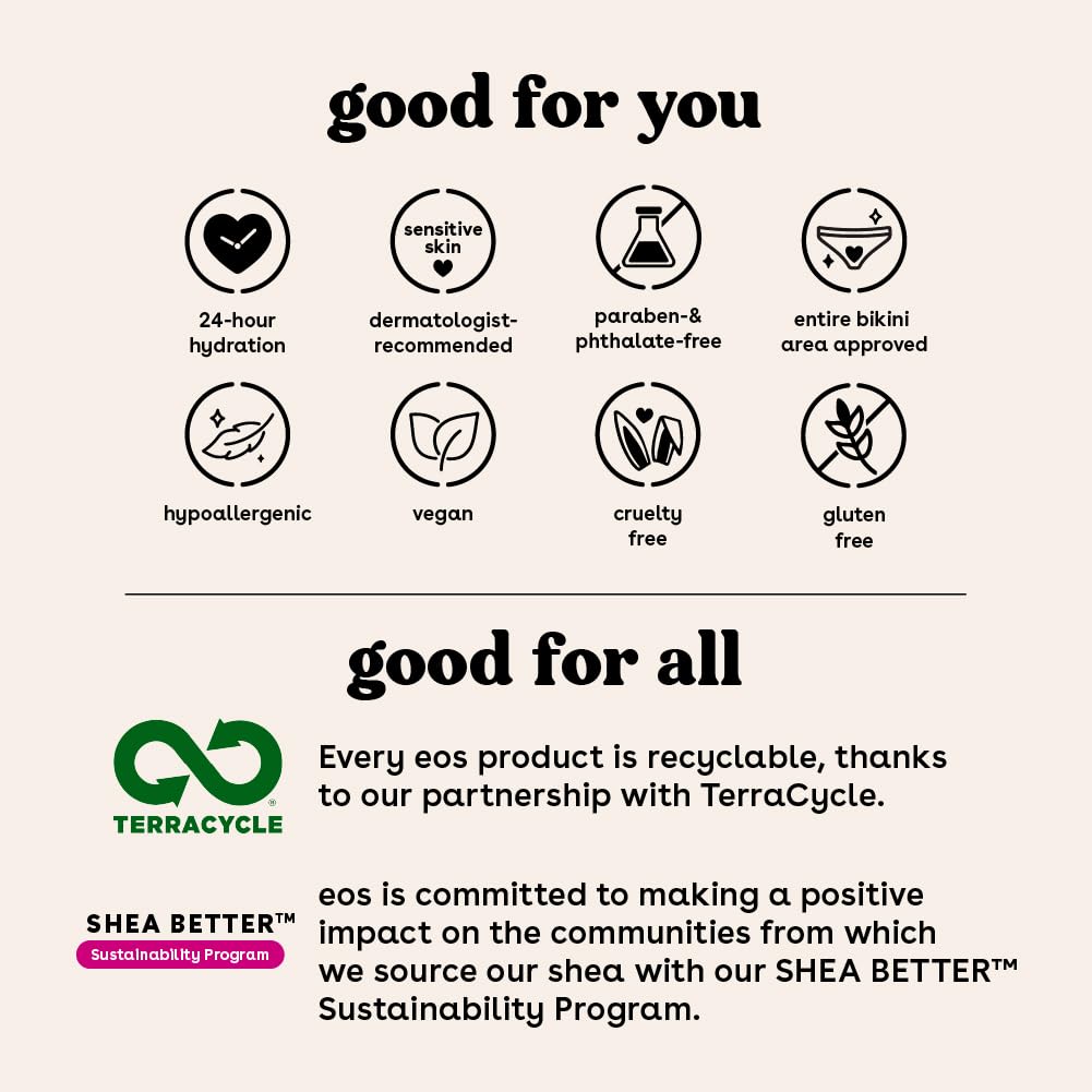 - ALL-NATURAL SHEA BUTTER: eos vegan shave creams have wild grown, sustainably sourced 100% natural shea butter to make your skin feel moisturized, protected, and soft. eos shave cream + lotion are paraben, phthalate and gluten-free. Leaping bunny certified. No products tested on animals.