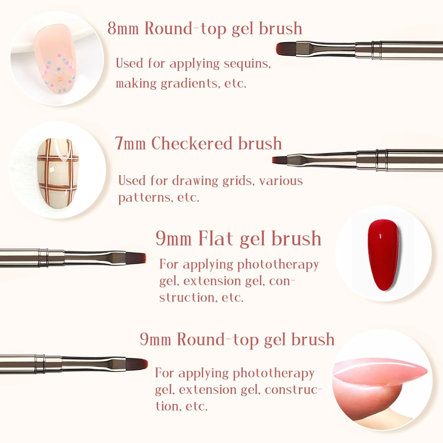 - Versatile Nail Art Brushes: This set includes 12 different brushes, including 4 liner brushes, 1 flat brush, 1 round brush, 1 angled brush, 1 gel brush, 1 ombre brush, 1 drawing brush, 1 builder brush, and 1 carved brush. Each brush is designed to cater to various nail art techniques and styles.