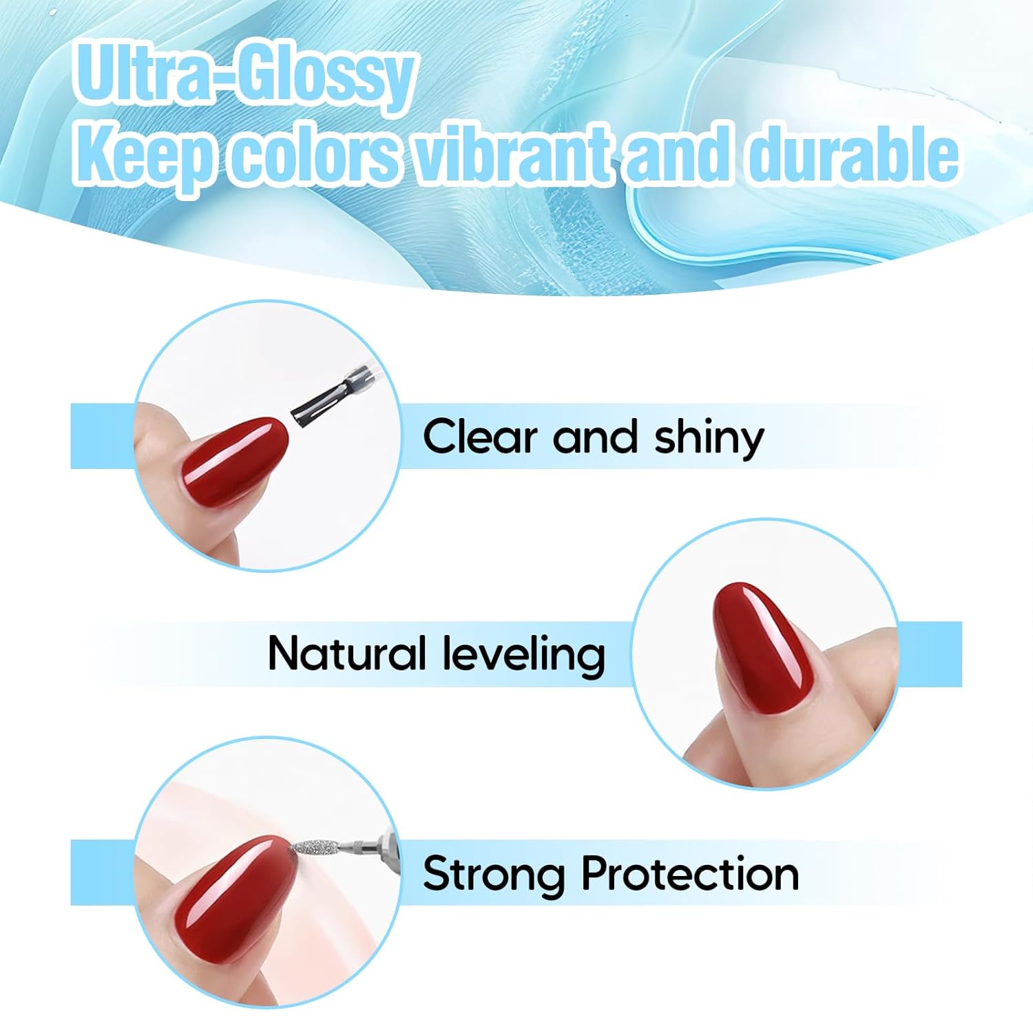 - Shiny Top Coat: You will get 15ml Large Capacity no wipe gel top coat. Help to protect the nail surface, keeping the gel from peeling off, and keeping the nails in a long shine finish.