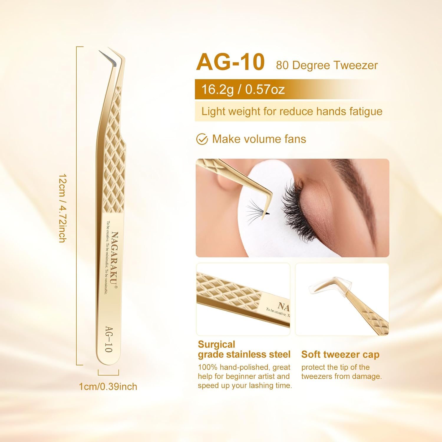 - 80 Degree Tweezer AG-10: Color: Gold / 4.45 inches; Width: 0.39 inches. These handcrafted tweezers are made of high-strength stainless steel, which is resistant to most acids and other corrosive agents. We give each tweezer a box to protect the tweezers
