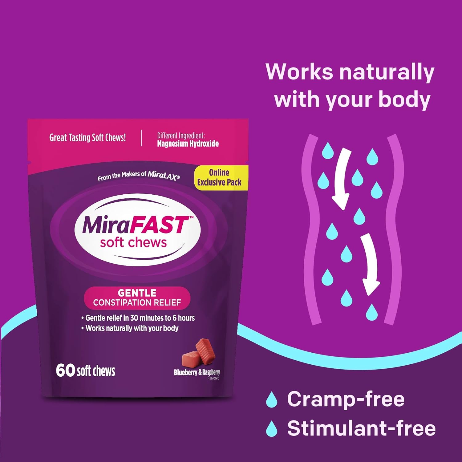 MiraFAST Soft Chews, from The Makers of MiraLAX, Gentle Constipation Relief, Fast Acting Laxative, Stimulant Free Saline Laxative, Magnesium Hydroxide, Blueberry & Raspberry Flavor, 60ct