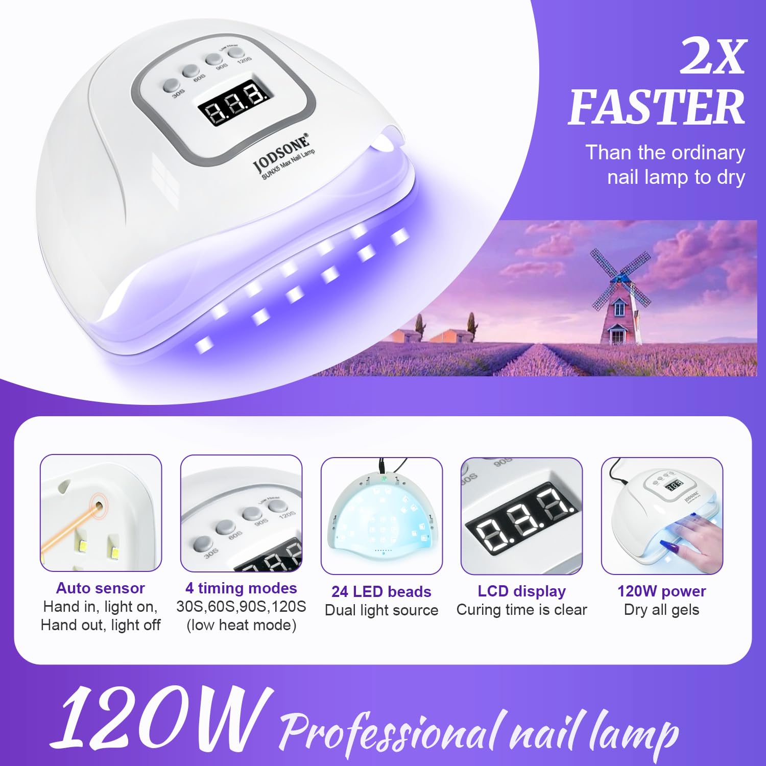 - Nail Lamp: This nail lamp has 4 curing modes; 30s, 60s, 90s and 120s. You can choose the curing time according to your situation. The nail lamp is lightweight and easy to carry and use.