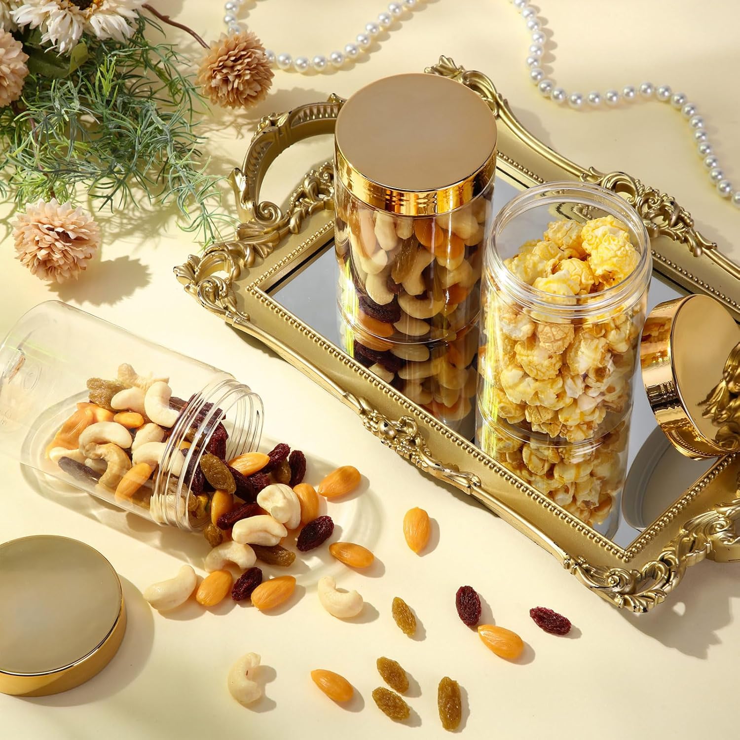 - What you receive: there are 4 pieces plastic jars with gold screw-on lids. They are durable and refillable, measuring about 2.8 inches/7.1 cm in diameter, 4.02 inches/10.2 cm in height, 10 oz in capacity