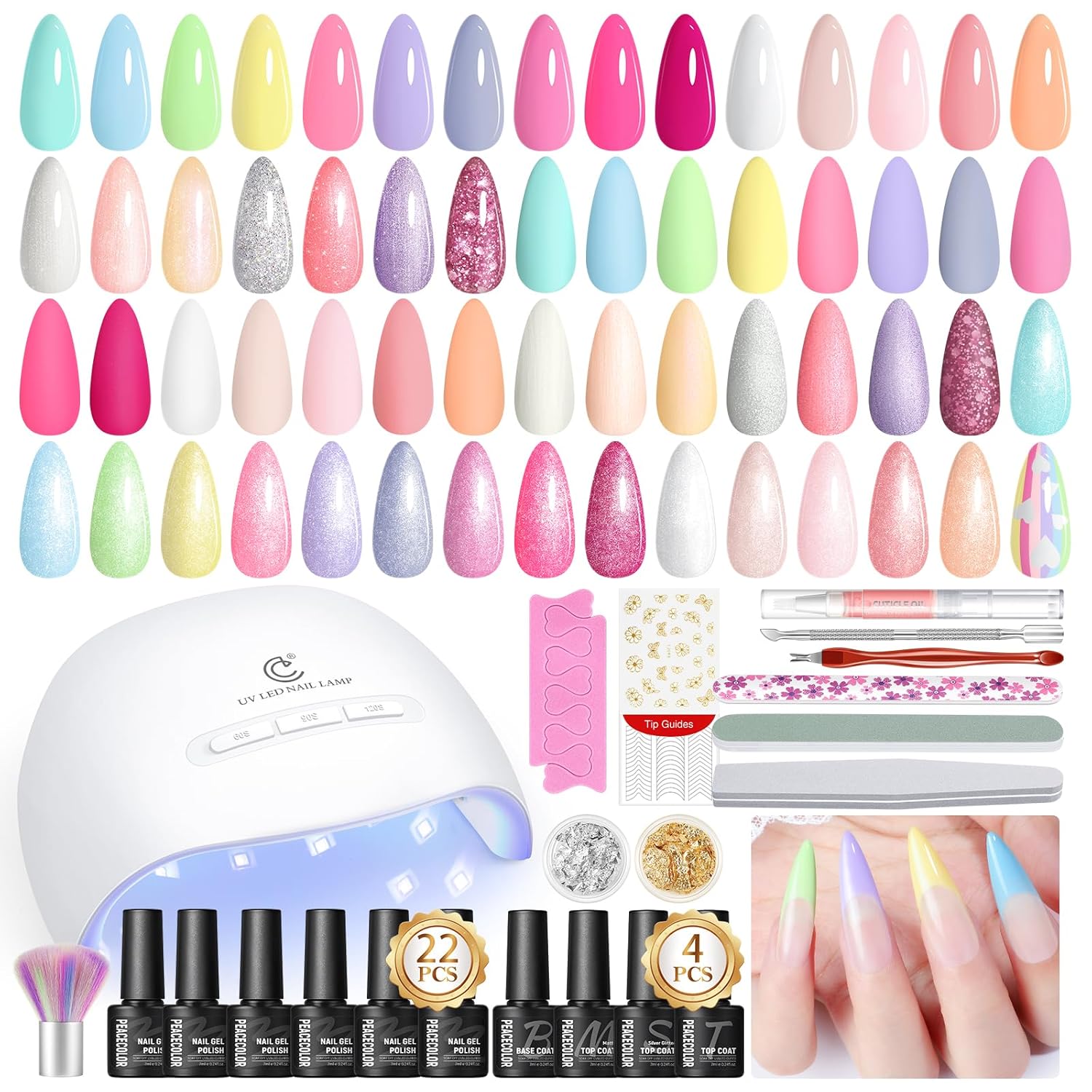 - Included Components : gel nail polish set, glossy/matte/silver glitter top coat, base coat, mainicure tools, French nail tips, nail art decorations, cuticle oil pen, nail lamp gel nail polish set, glossy/matte/silver glitter top coat, base coat, mainicure tools, French nail tips, nail art decorations, cuticle oil pen, nail lamp
