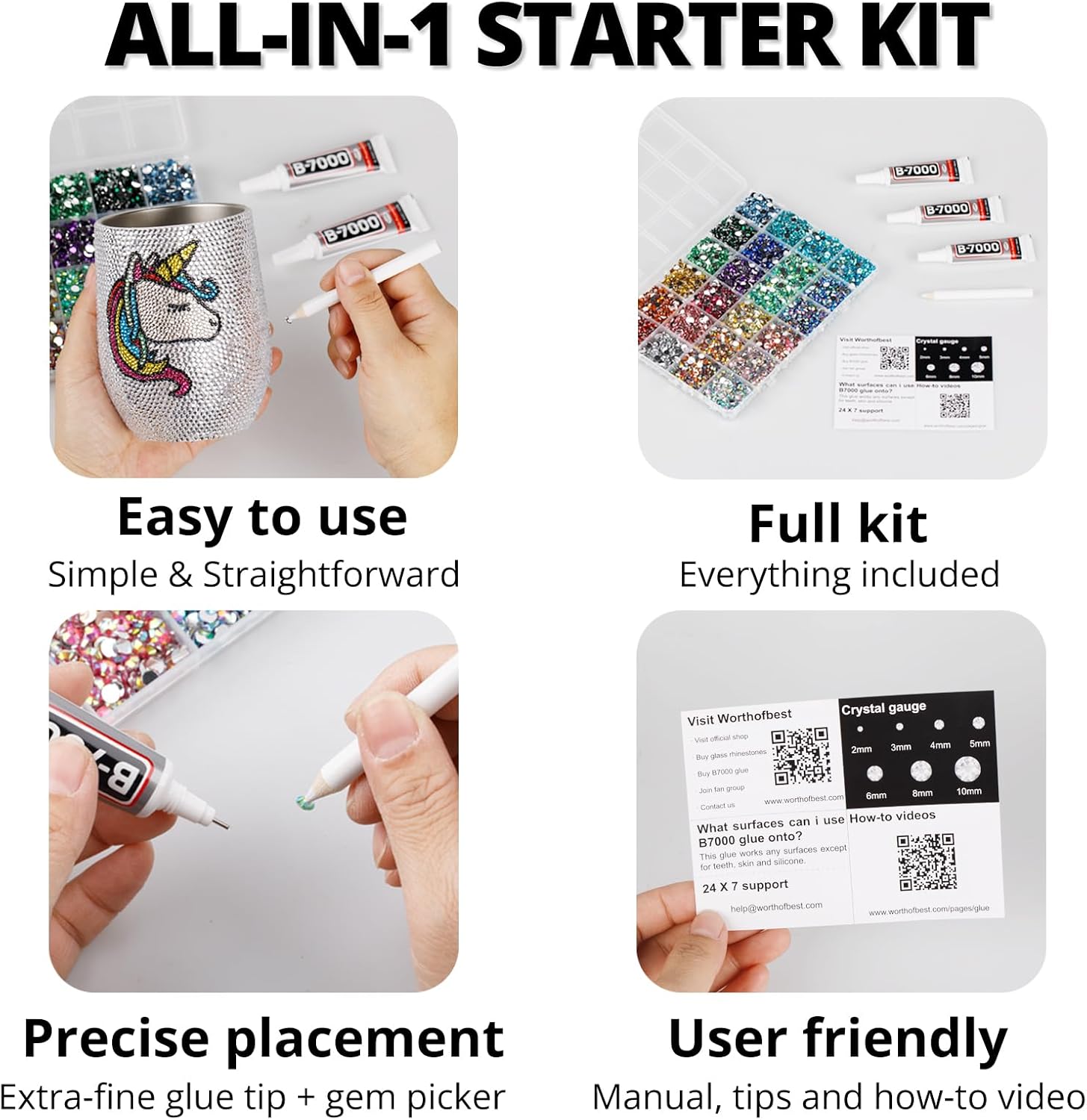 - Easy to Use -- This kit is designed to be straightforward, and versatile for various crafting projects. The manual is user-friendly and beneficial for both novice and experienced crafters. The complete and durable tools are suitable for precisely applying rhinestones to create intricate designs, with no additional tools required. Rhinestones are easy to apply and remove. The sturdy container with 24 grids keeps all rhinestones organized by size and color, making them easy to store and access