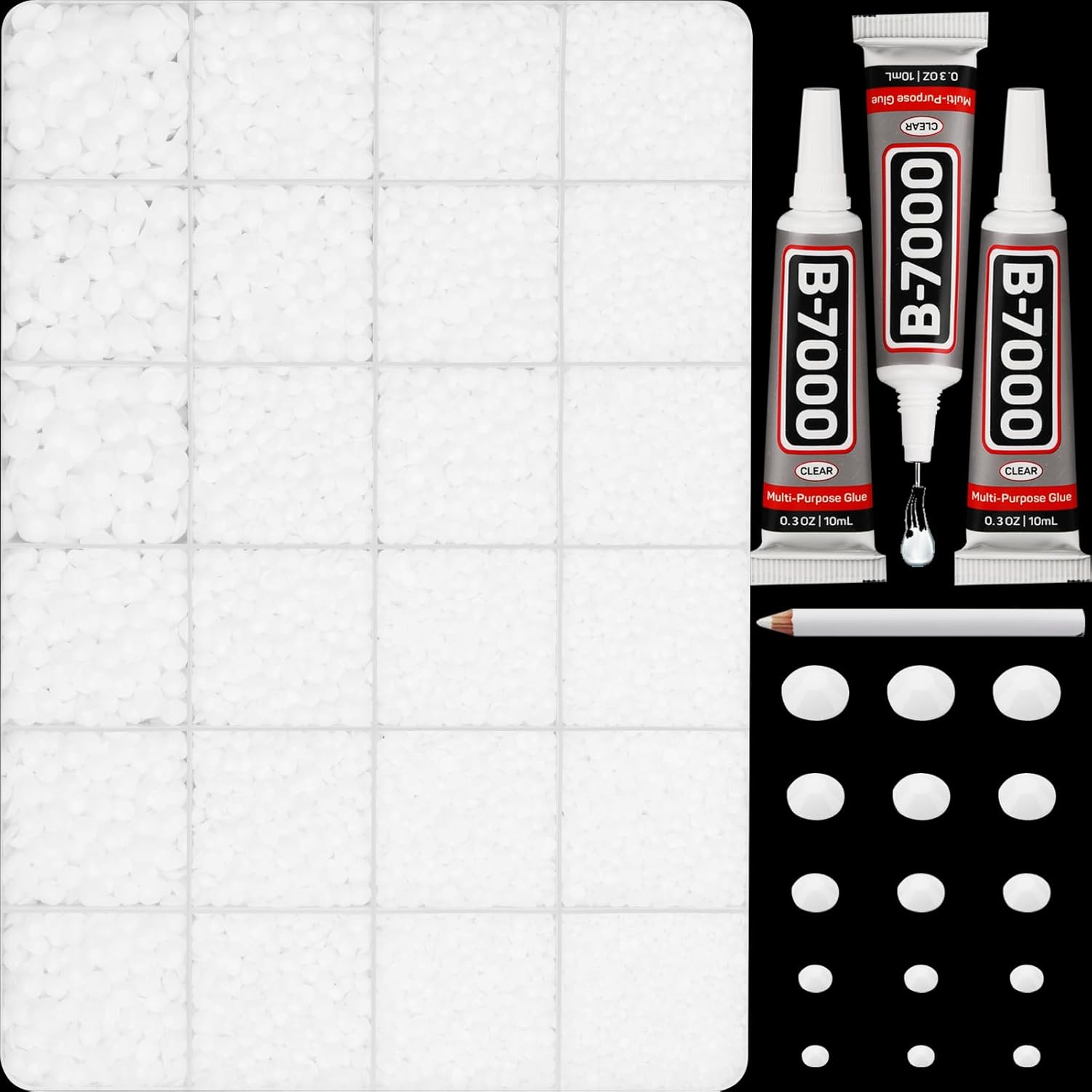 - Package Content with Tool (pickup pen and manual) -- The bedazzler kit Package includes 1 solid white rinestones set with 24 grids, approx. 30000 pcs of 2-6mm bling-out resin rhinestones
