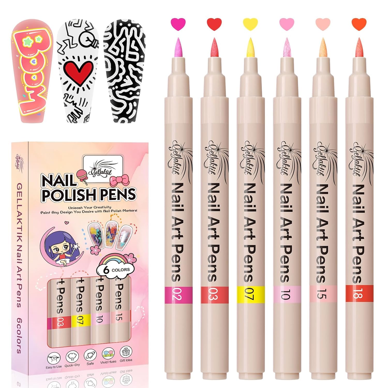 6 Colors Nail Art Pens Set, 3D Nail Polish Pens Quick-Drying Acrylic Paint Markers, Dotting Liner Brush for DIY Nail Design, Home & Salon Manicure Tools