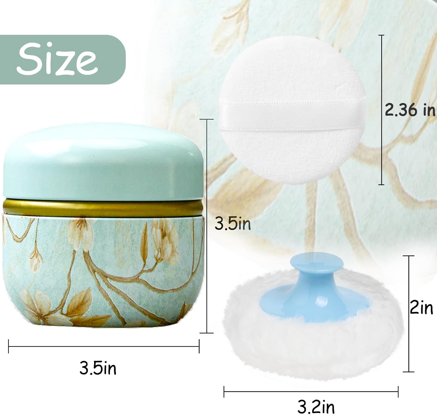 - Size: The powder box is 3.2" diameter/width.The powder puff is 3.15"/8cm in diameter and 2"/5cm in height.The small powder puff is 2.36"/6cm in diameter.