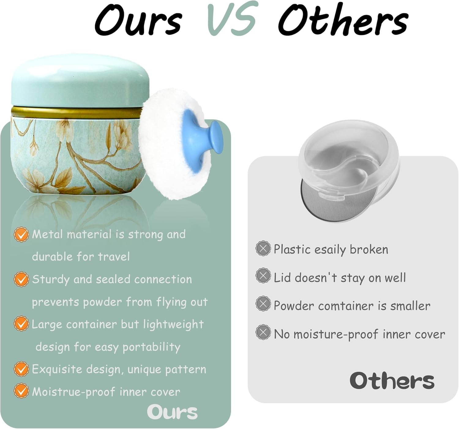 - Product contains a well-made powder case, a high quality powder puff with a handle and a small powder puff.