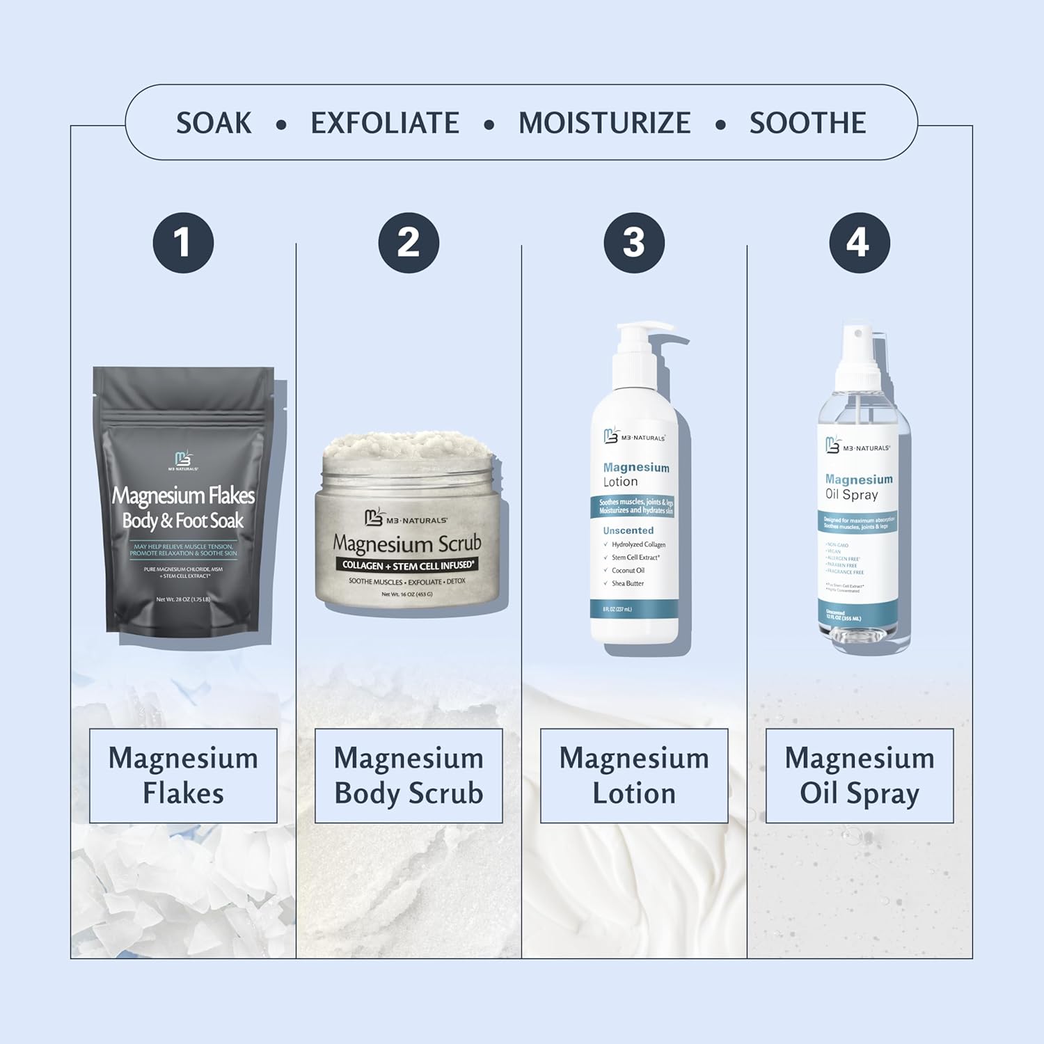 - Skin-Loving Ingredients from Nature: Made with only the finest ingredients for all skin types, M3's Magnesium Bath Scrub has been rigorously examined to keep out unnecessary harsh additives—using only what your skin will love. Made in USA with domestic and globally sourced ingredients. M3 Naturals is a brand that contains products that contain natural ingredients and other ingredients.
