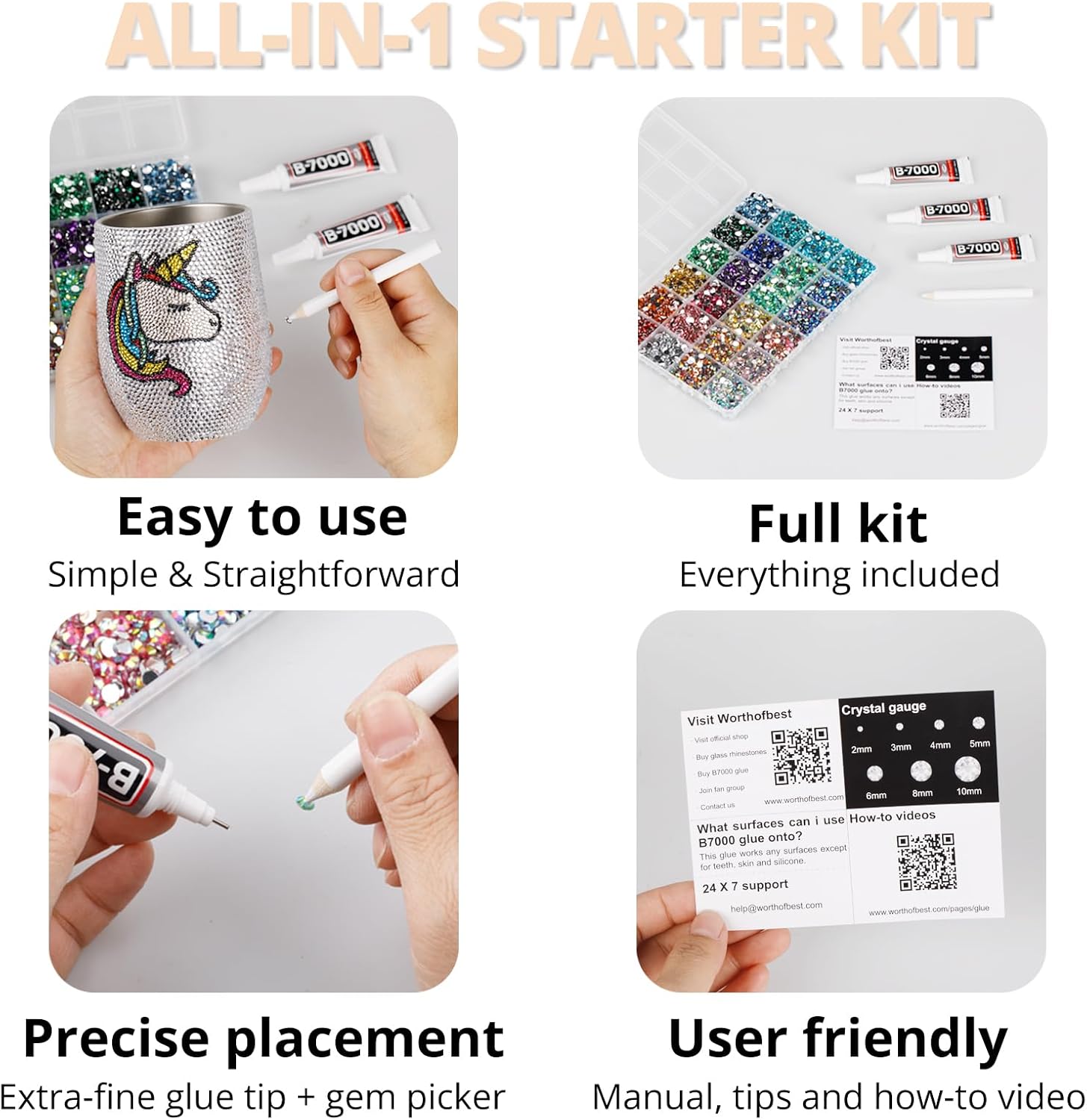 - Easy to Use -- This kit is designed to be straightforward, and versatile for various crafting projects. The manual is user-friendly and beneficial for both novice and experienced crafters. The complete and durable tools are suitable for precisely applying rhinestones to create intricate designs, with no additional tools required. Rhinestones are easy to apply and remove. The sturdy container with 12 grids keeps all rhinestones organized by size and color, making them easy to store and access