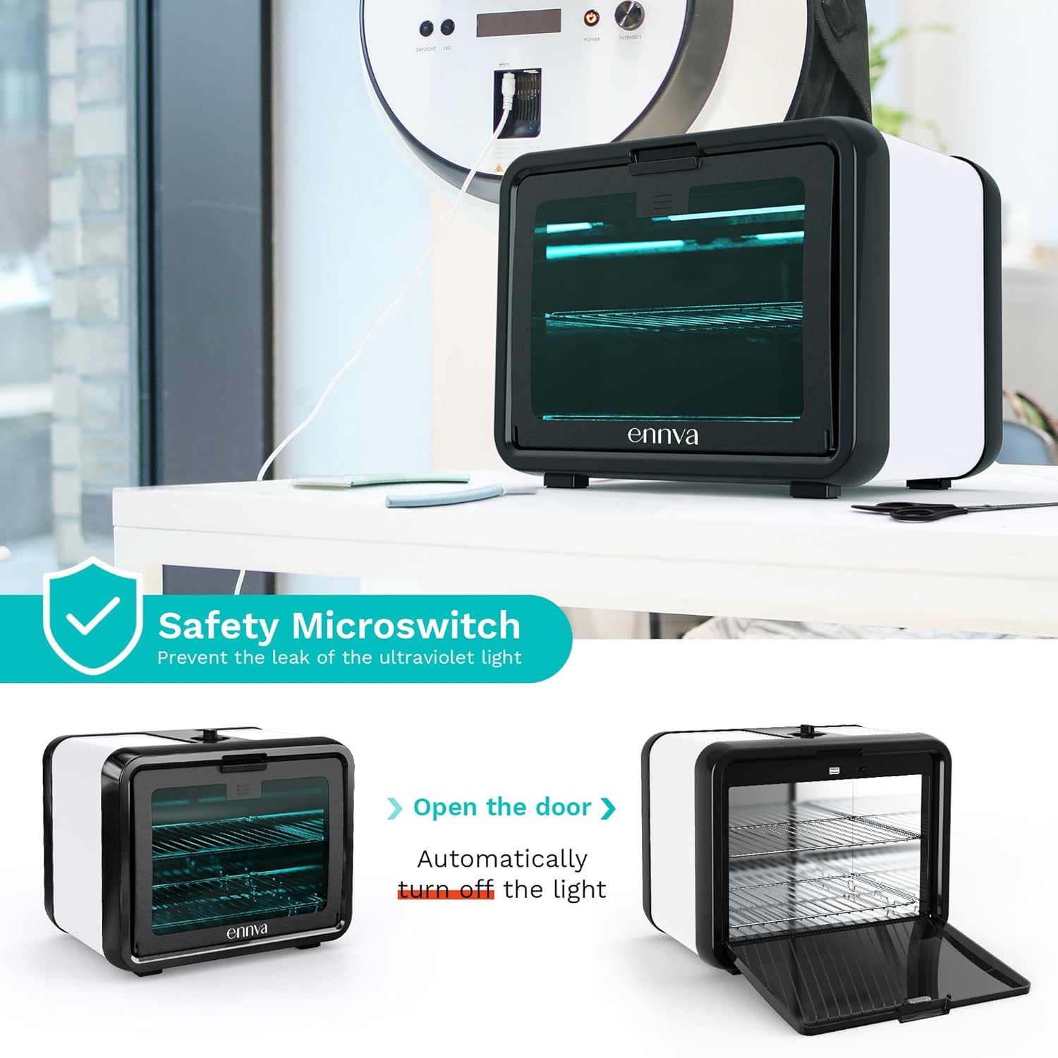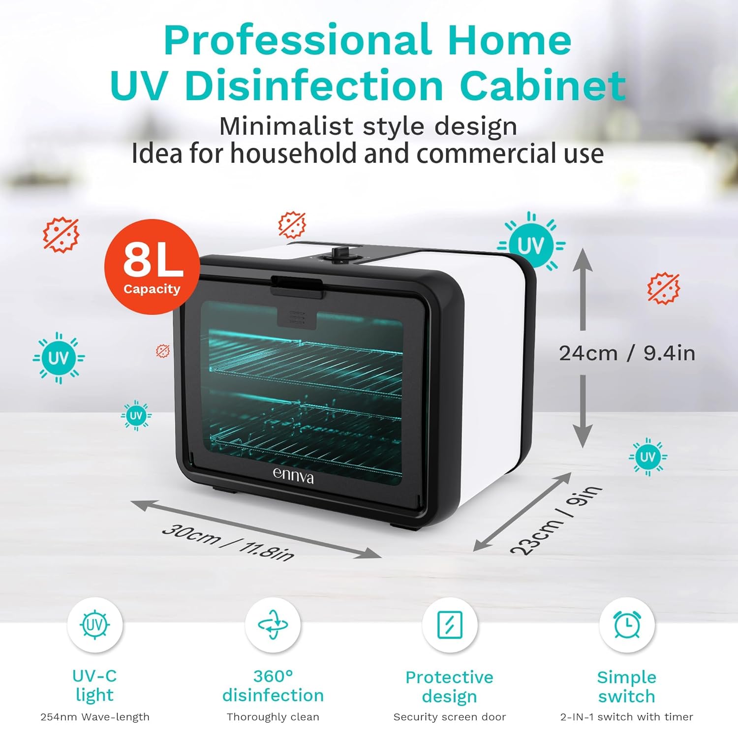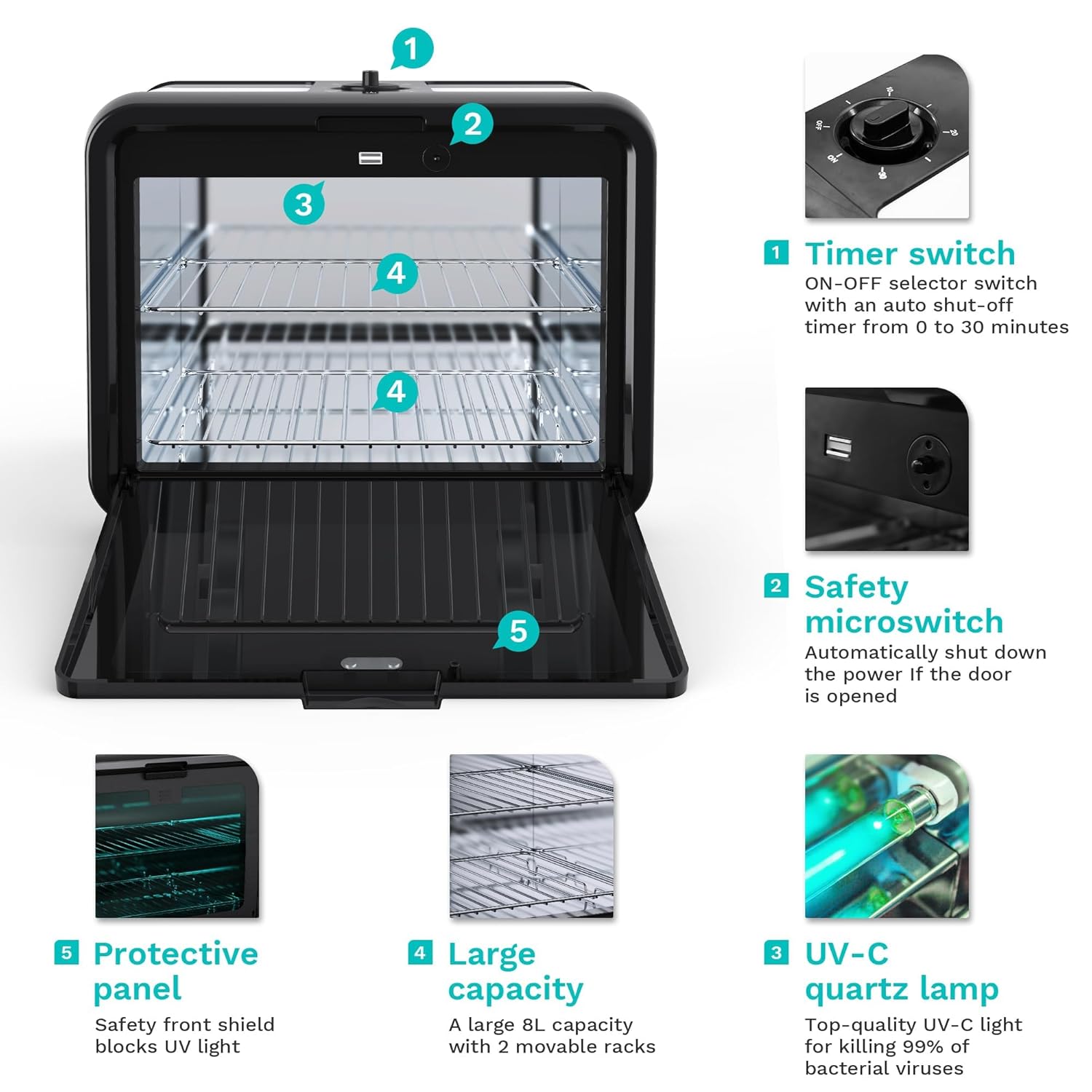 - GET A USER-FRIENDLY SANITIZER: Our UV light cleaner is equipped with a protective panel to prevent accidental scalding, a timer with a 0-30 minute setting, and a safety switch that automatically cuts off the power when the door is opened