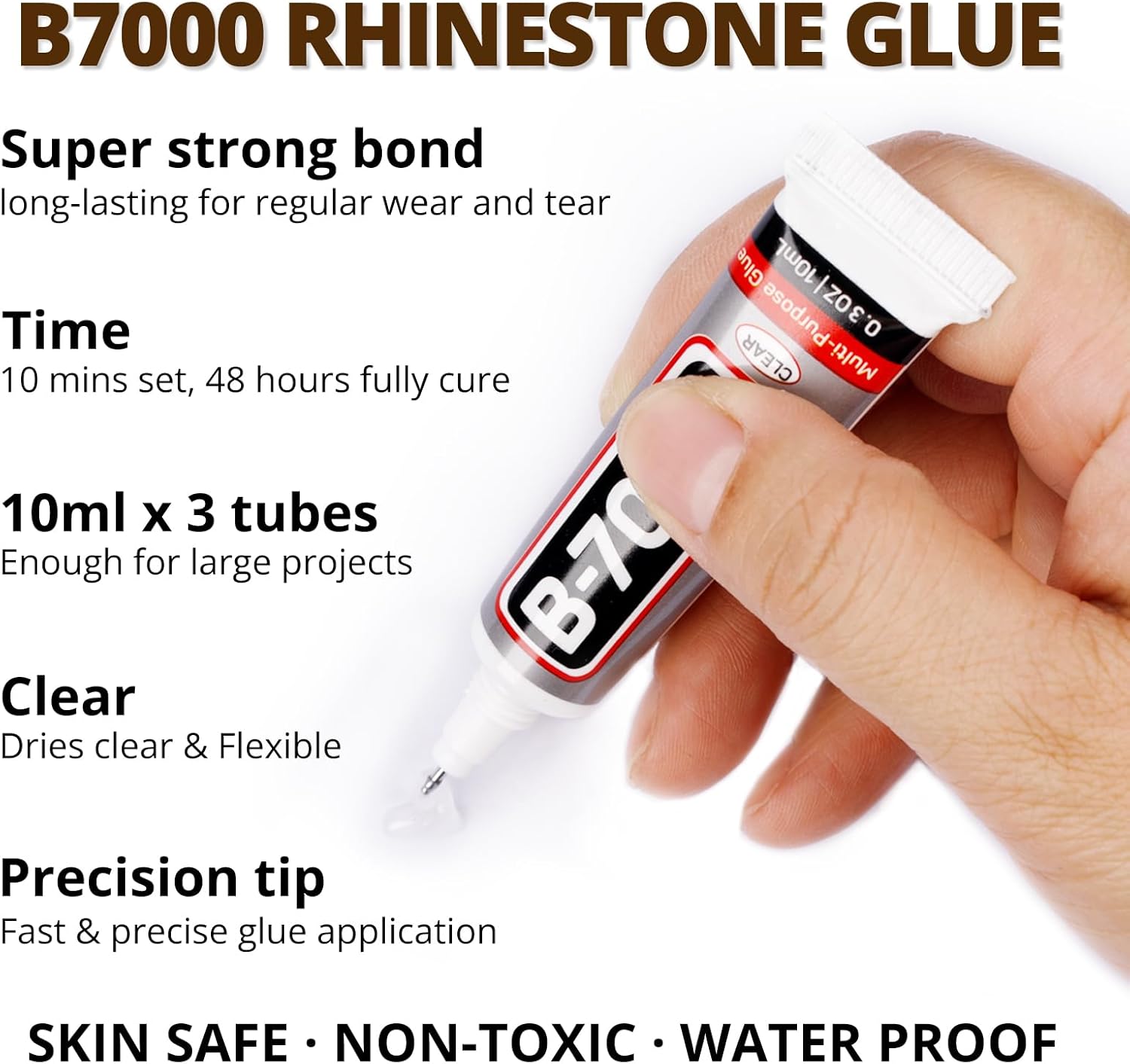 - B7000 Clear Glue for Gemstones -- B7000 glue has strong adhesion and dries clear, waterproof when dried, non-toxic and harmless to the skin. The glue has a precision needle for easy application, they can be applied precisely