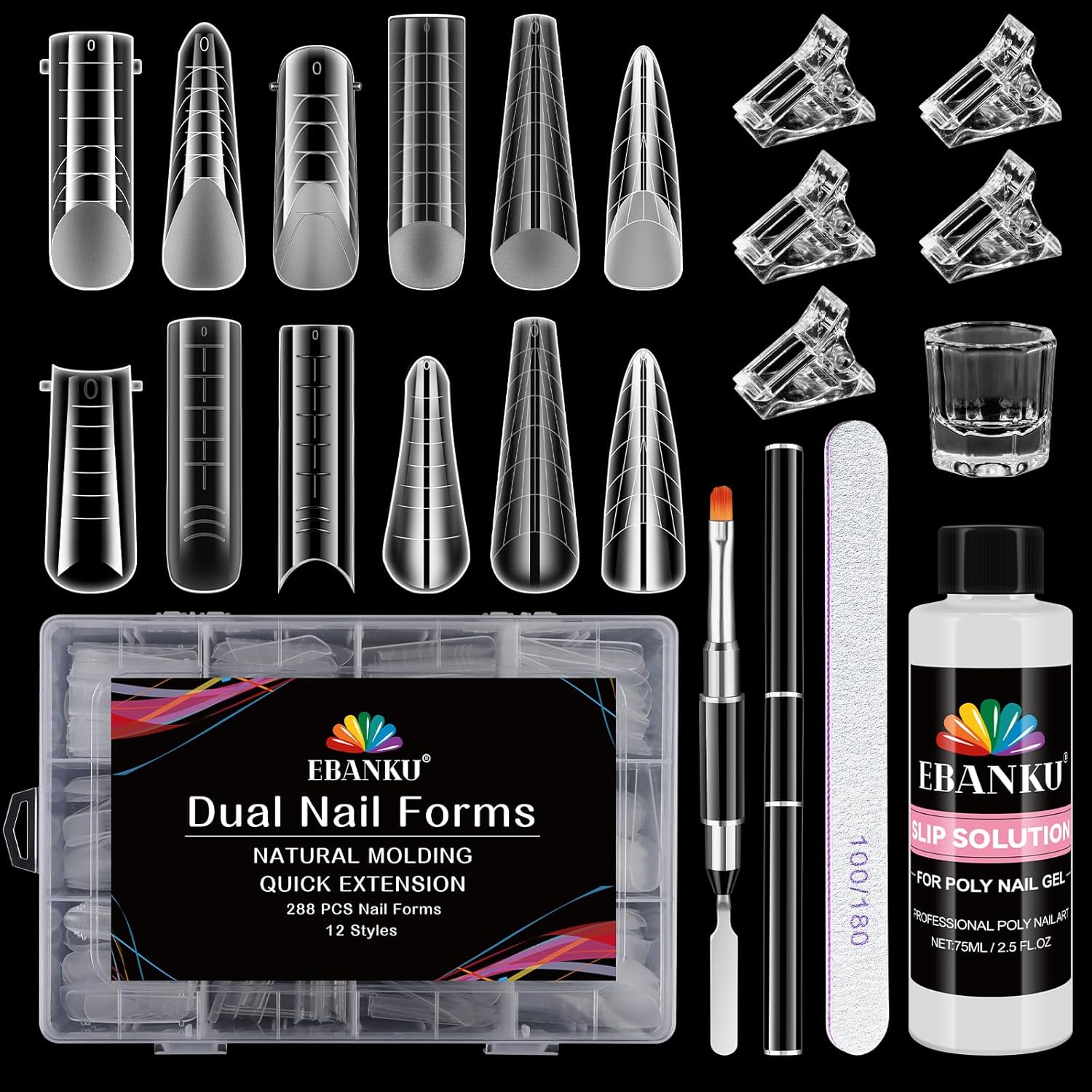 EBANKU Poly Gel Nail Forms Kit - 288PCS Reusable Dual Forms for Builder Gel, Nail Mold Kit with 2.5oz Slip Solution, Brush, File, 5PCS Clips - 12 Shapes
