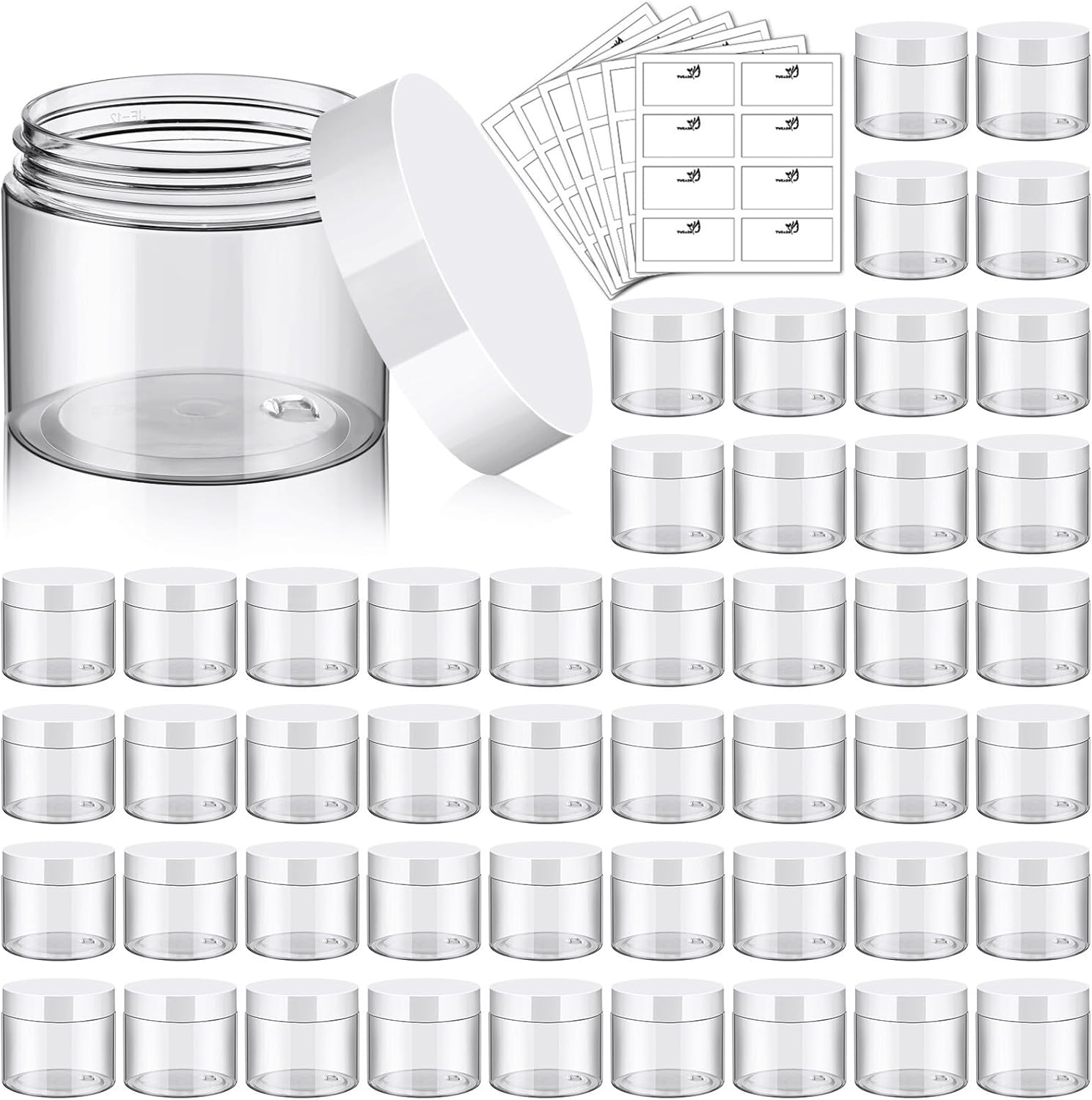 TUZAZO 48 Pack 6 Oz Plastic Container Jars with Lids and Labels BPA Free, Empty Round Clear Cosmetic Containers Plastic Slime Jars for Lotion, Cream, Ointments, Body Butter, Travel Storage (48)