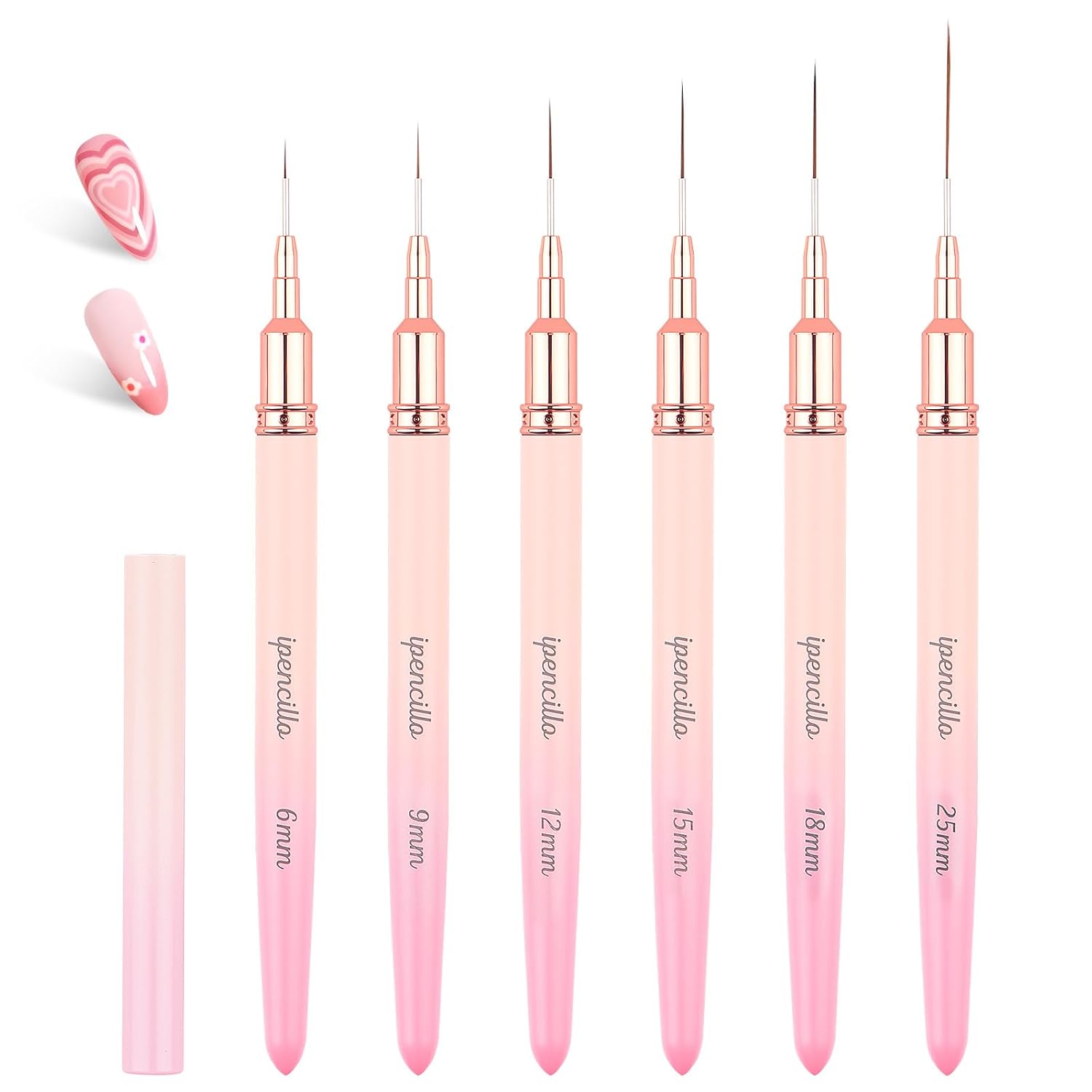 - 6 Sizes Nail Liner Brushes for Versatile Designs: The nail art brushes include 6/9/12/15/18/25mm. Each nail brush is engraved with a length indicator for easy identification. This range of lengths helps nail art enthusiasts to choose the most suitable nail brushes for their needs, allowing them to master various line lengths, contouring, and complex patterns effortlessly.