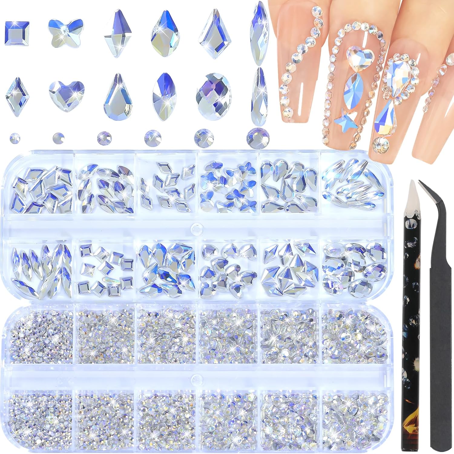 - ★Moonlight Blue nail rhinestones and Charms set- contains 2 boxes nail art rhinestones, flat back nail rhinestones, Multi-shape nail gem rhinestones, 1pcs tweezer for large size gems, 1pcs pickup pen for small size gems and 6 sizes round nail art rhinestones are 1.8mm, 2mm, 2.5mm, 2.8mm, 3mm, 4mm, different sizes of mixed crystal rhinestones can match different nail art styles,will bedazzle your acrylic nails!