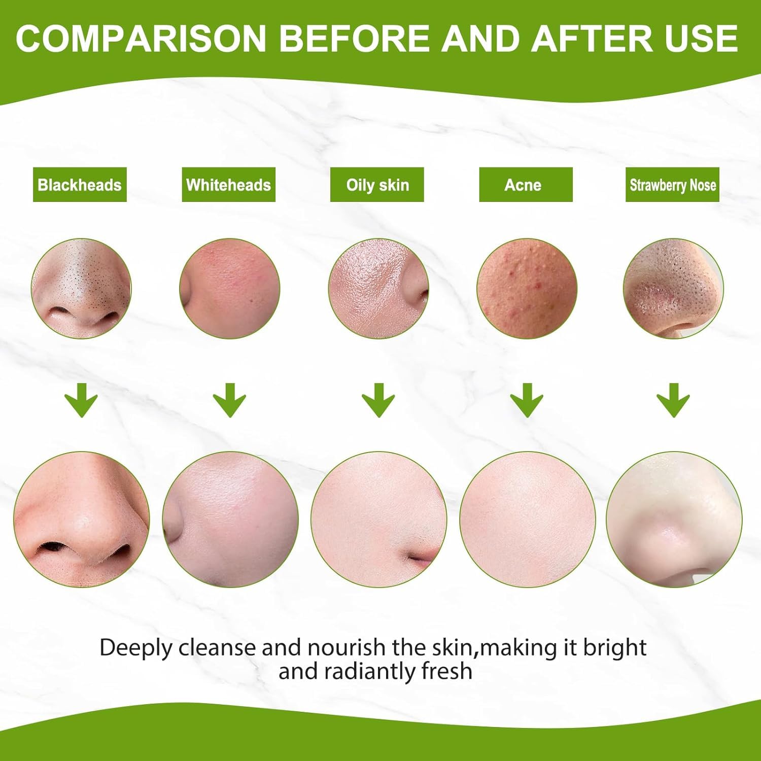 - 🌿Gentle Blackhead Removal Formula: This blackhead removal mask features a gentle formula that quickly penetrates pores to eliminate blackheads, whiteheads, dirt, and fine hairs from the forehead, nose, chin, and cheeks. The result is clean, refreshed skin that looks smoother and clearer.